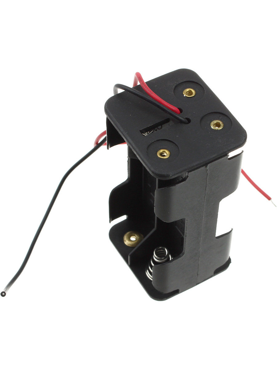 Батарейный отсек (держатель батареек) двусторонний для двух батарей типоразмера АА с контактными проводами предназначен для подключения питания в различном оборудовании (в том числе, в бытовых устройствах, игрушках и радиоуправляемых моделях). В целях ускорения и удобства монтажа держатель выполнен с двумя проводами (красного и черного цвета) длиной по 15 см, т.е. не требует пайки контактов. Окончания проводов подготовлены для дальнейшего монтажа: зачищены и облужены оловом. Суммарное напряжение при использовании 2-х батареек на 1.5 В -составит 3 В.