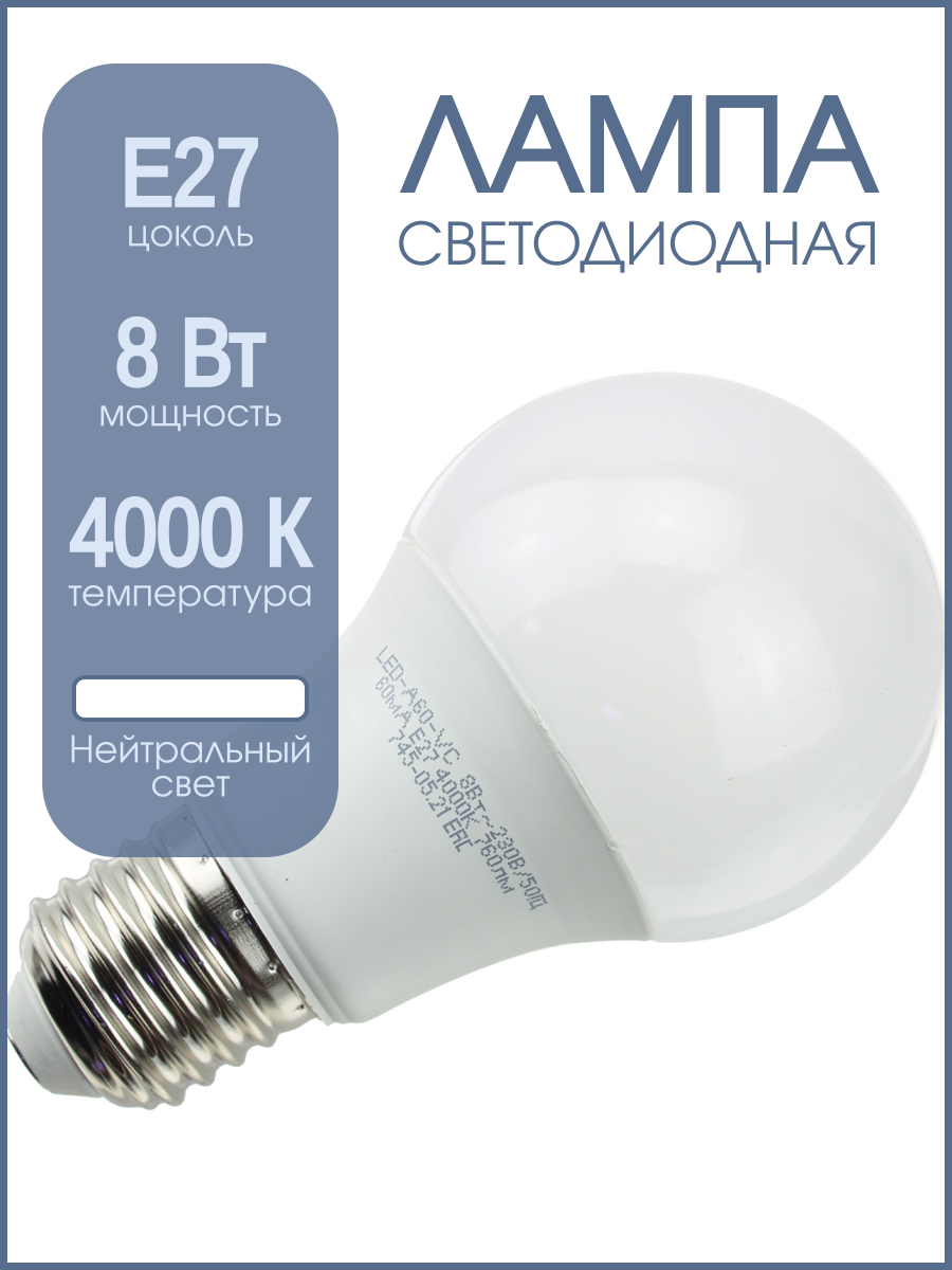 Лампа светодиодная LED-A60-VC 8Вт 230В Е27 4000К 720Лм in home