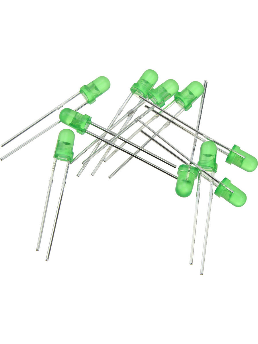 Светодиод 3мм, цвет зеленый, зеленая линза, упаковка 10шт