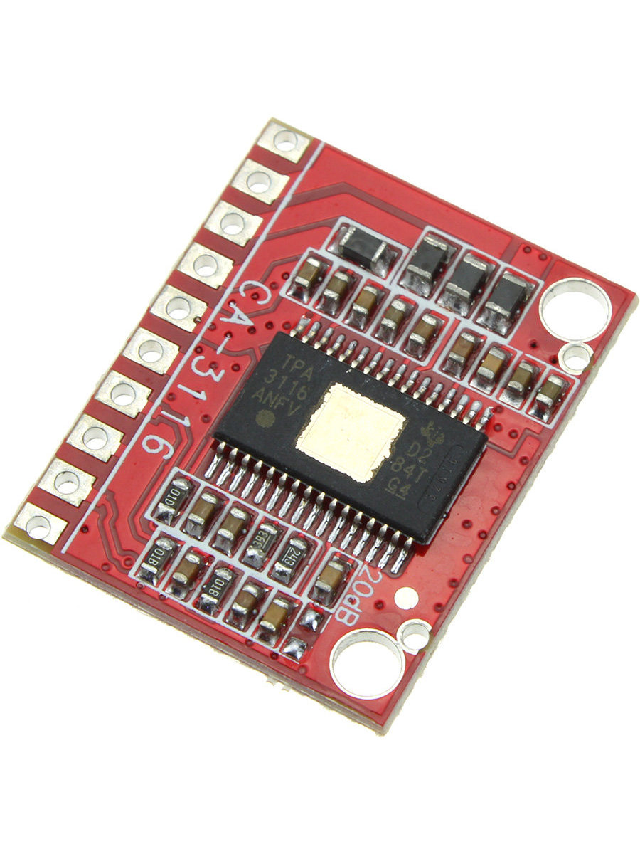 Модуль аудио стерео усилителя класса D на чипе TPA3116D2, рассчитанного на 2 канала, мощностью 2х50 Вт с питанием до 24В.
