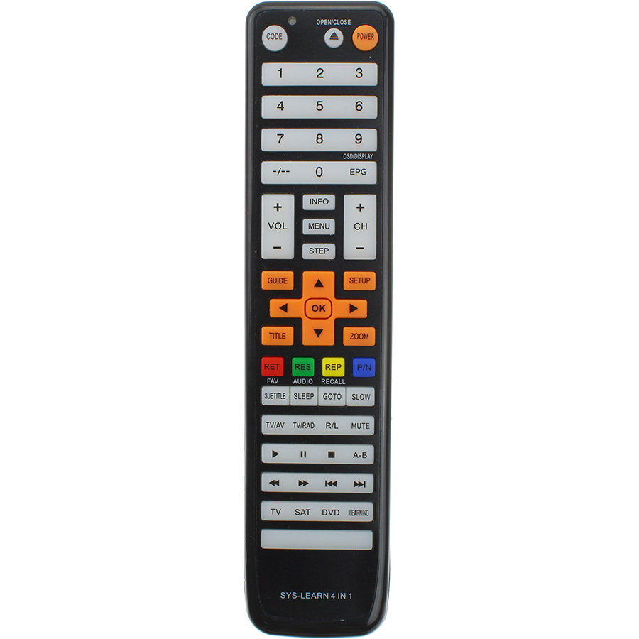 С помощью этого пульта вы сможете объединить до четырех пультов от разной техники в одном! Например, пульт от ТВ, DVD плеера, спутникового ресивера и музыкального центра! Настройка на ТВ, DVD и SAT производится ручным вводом кода или автопоиском кода, всего в базе более 3000 вариантов кодов! Пульт поддерживает как самые распространённые корейские, японские, европейские бренды, так и самые редкие китайские производители, например: LG, Samsung. Toshiba, Sony, Panasonic, Sharp, Supra, Mystery, Aiwa, Akai, Akira, Beko, Blaupunkt, Casio, Daewoo, Fujitsu, Funai, Goldstar, Grundig, Hisense, Hitachi, Hyundai, JVC, Loewe, Mitsubishi, Nec, Nokia, Orion, Pioneer, Shivaki, TCL, Telefunken, Thomson, Vestel, Yamaha и многие другие.