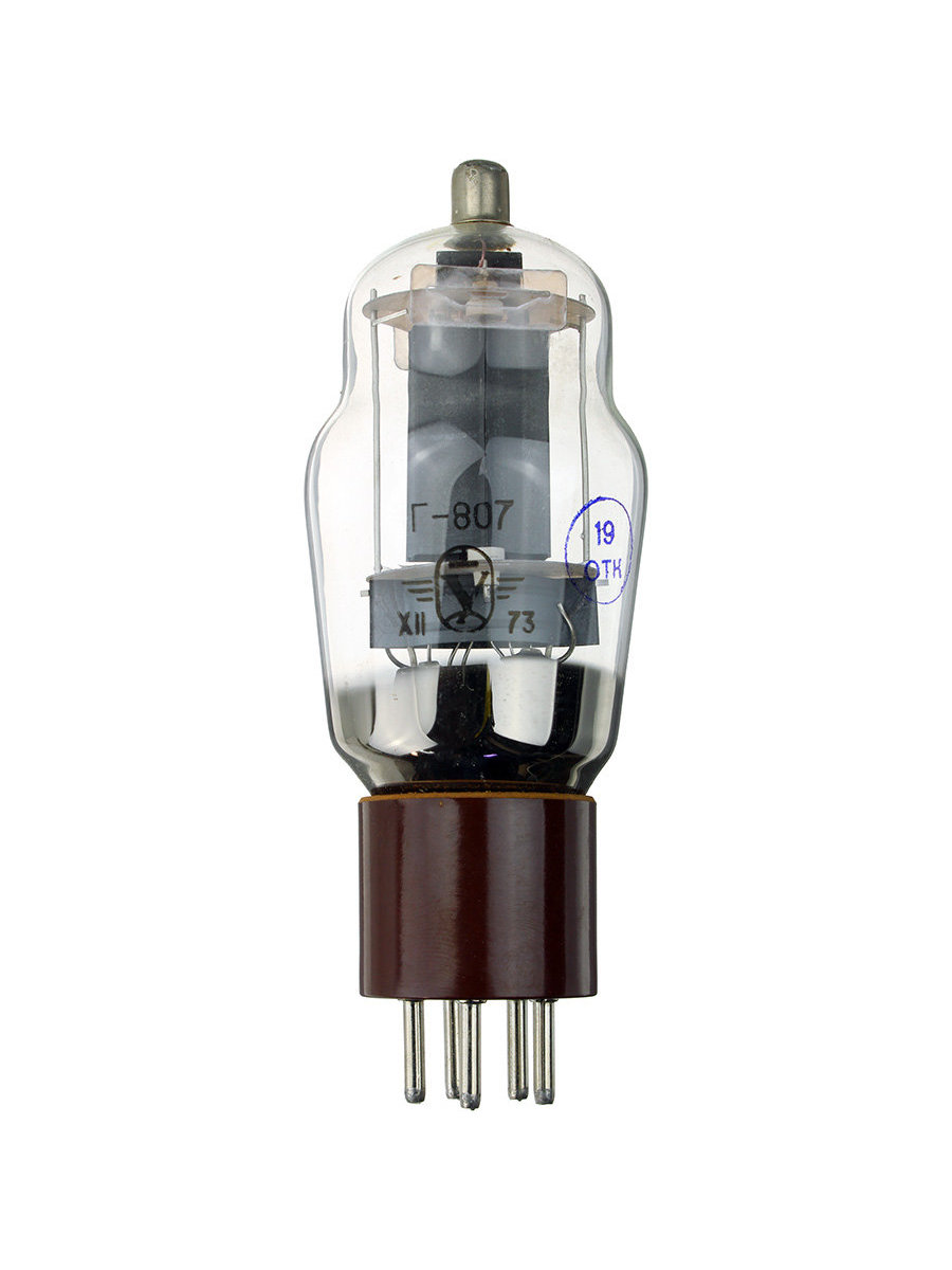Генераторный лучевой тетрод Г-807 с оксидным катодом косвенного накала в стеклянном баллоне со специальным цоколем и естественным воздушным охлаждением.