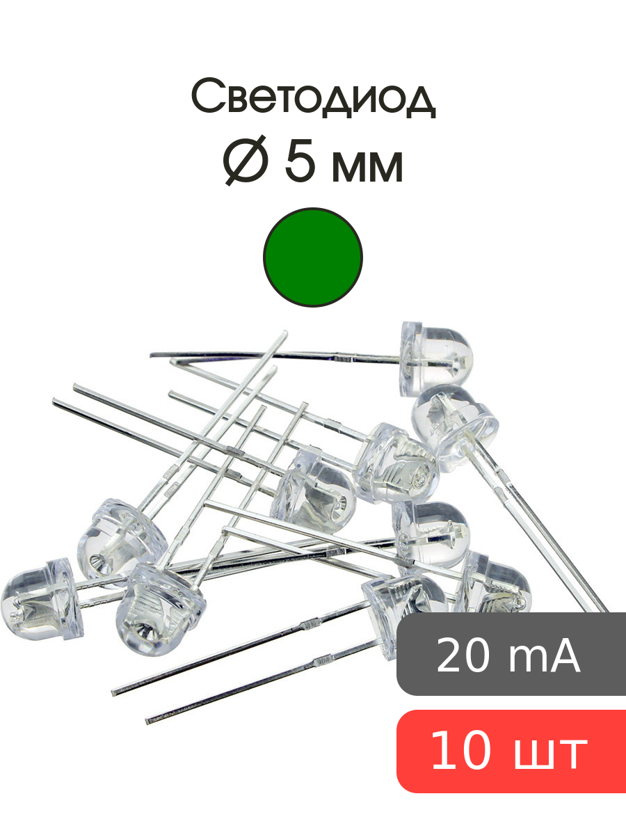 Светодиод 5мм, 3V, цвет зеленый, прозрачная линза 120*, упаковка 10шт