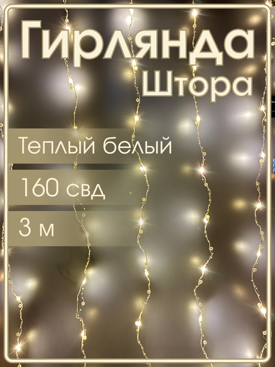Гирлянда "Роса" штора 160 СВД, жемчуг 10 нитей, 3х2, цвет белый теплый