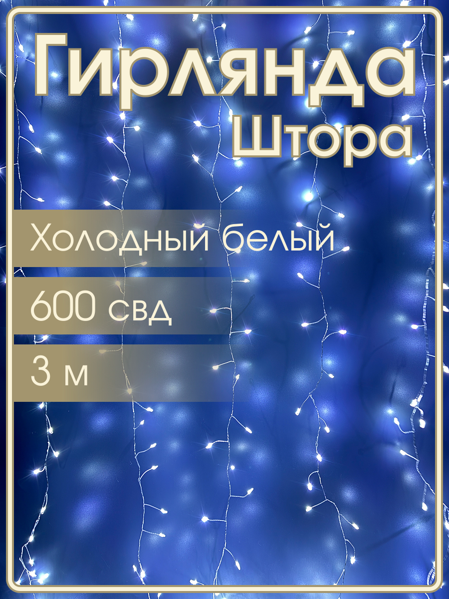 Гирлянда "Роса" штора 600 СВД, 3х2м, цвет холодный белый