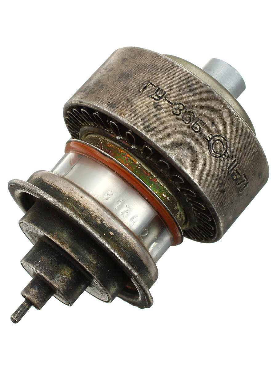 Генераторный тетрод ГУ-33Б в металлокерамическом исполнении с оксидным катодом косвенного накала и принудительным воздушным охлаждением.