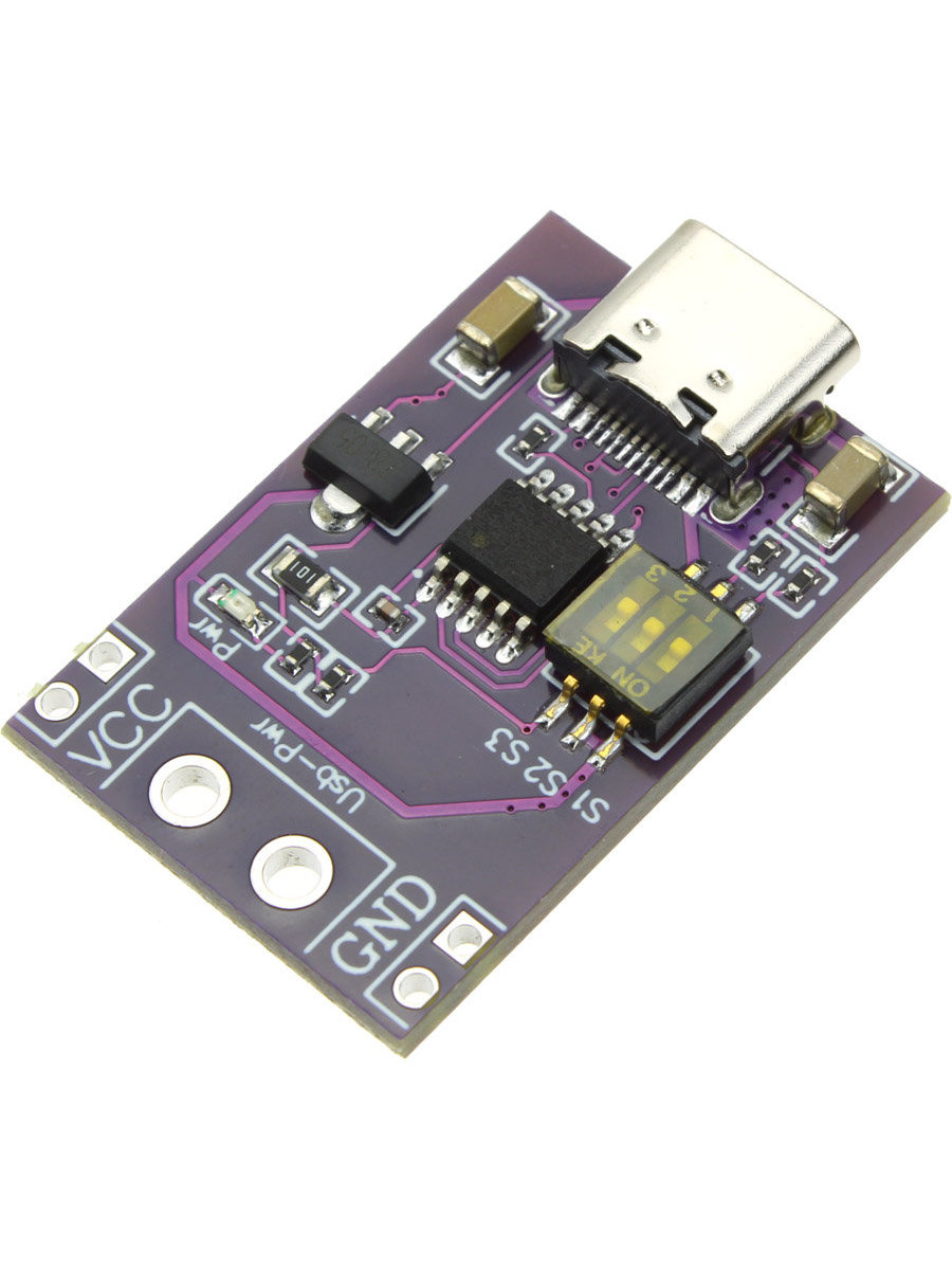 Предлагаемый модуль имеет вход Type-C, удобные контактные площадки для выходного напряжения и многофункциональный микроконтроллер. Желаемое напряжение задаётся при помощи комбинации DIP-переключателей — схема коммутации есть с обратной стороны платы.
