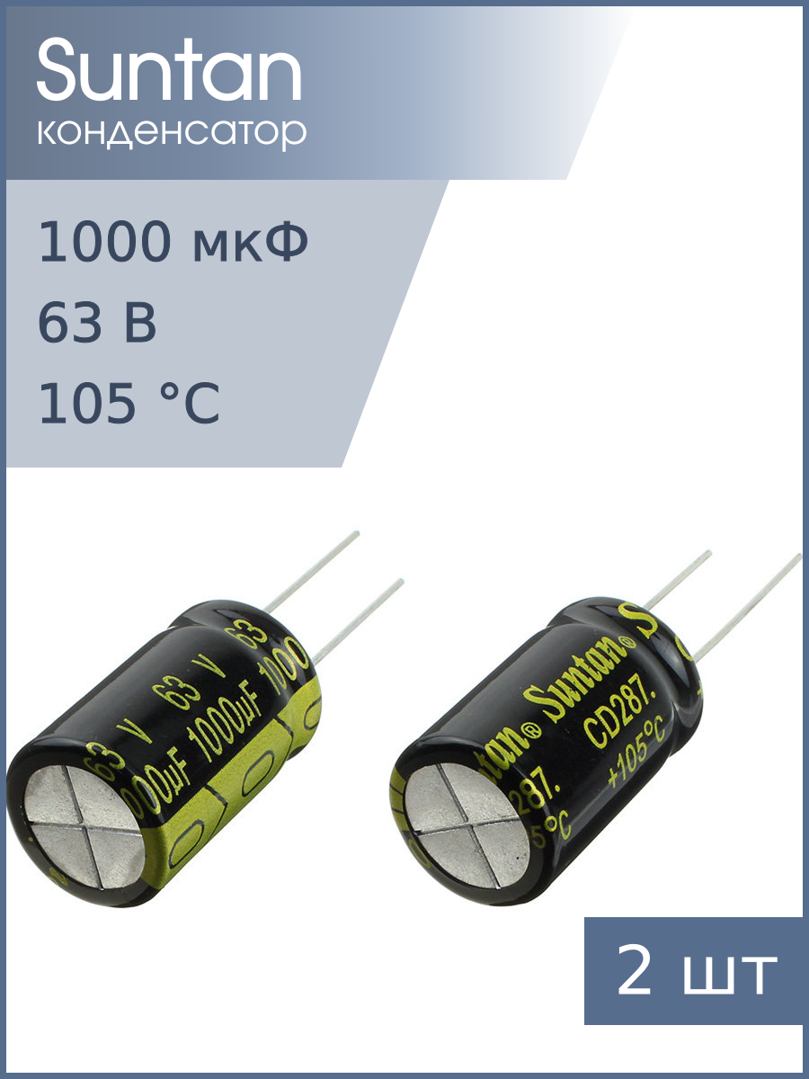 Конденсатор 1000мкФ 63В 16*26мм 105С (упаковка 2шт) Suntan TS13DJ1J102MSB0C0R 2400мА 5000час