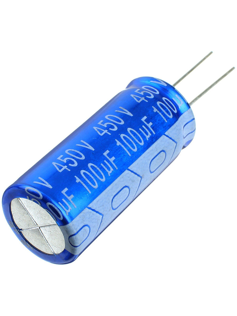 Тип Конденсатор алюминиевый электролитический 100мкФ 450В ±20% (18 X 40мм) радиальный 7.5мм 490мА 2000час 105C россыпь