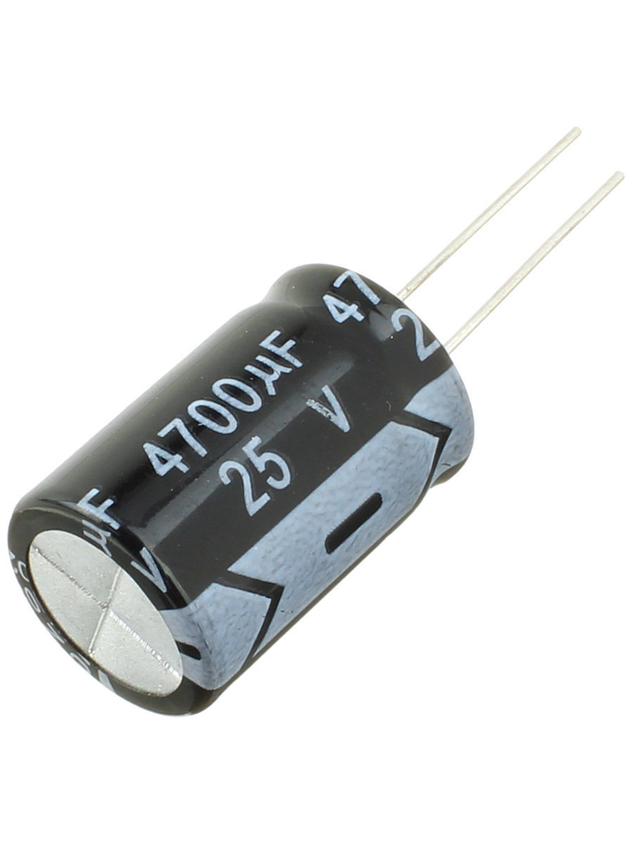 Тип конденсатора: Конденсатор алюминиевый электролитический 4700мкФ 25В ±20% (16 X 25мм) радиальные выводы 7.5мм 2000час 105С россыпь
