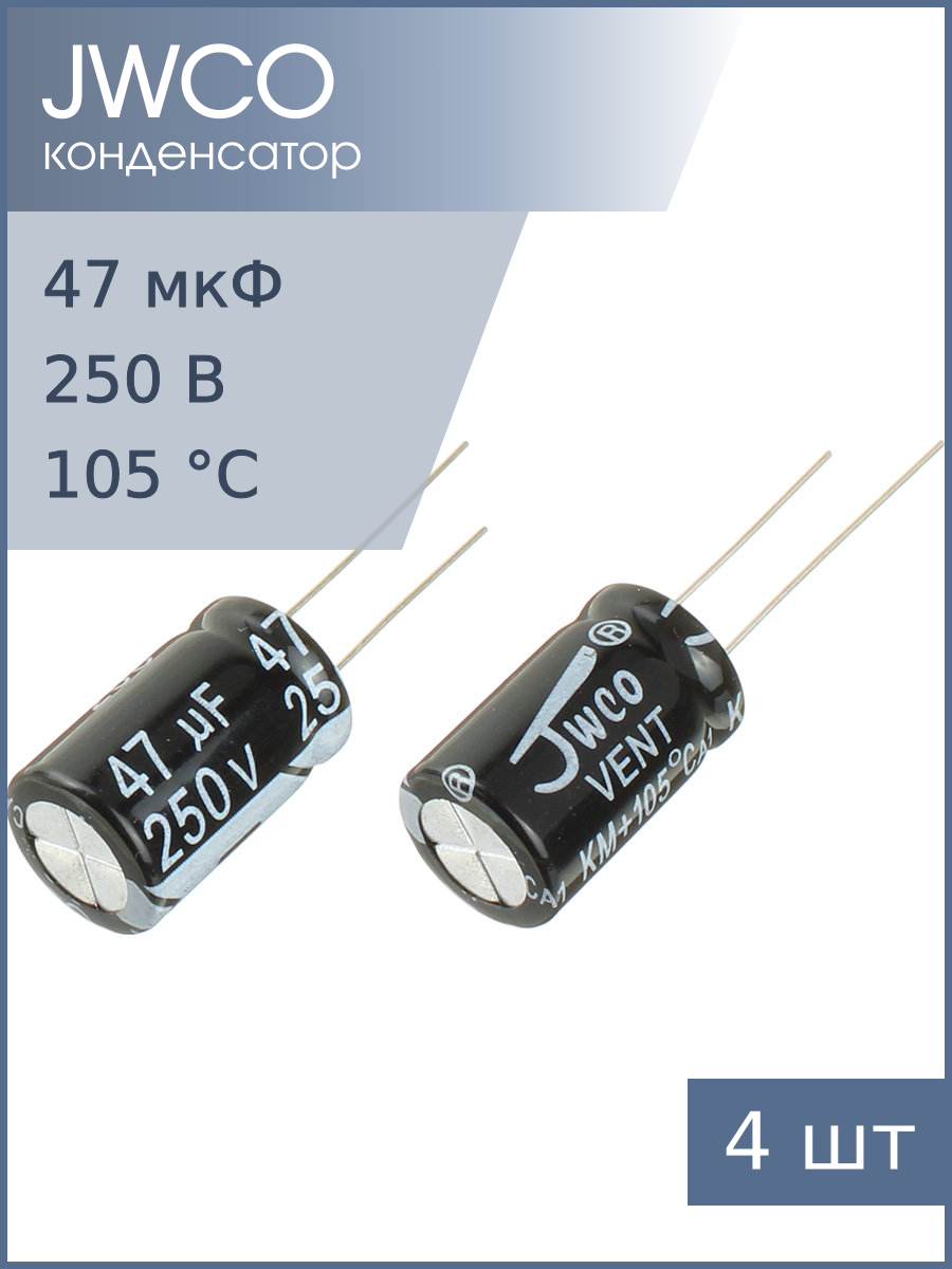 Конденсатор 47мкФ 250В 13*21мм 105С (упаковка 2шт) Jwco KM470M2EBKJ1321VBK 235мА 2000час