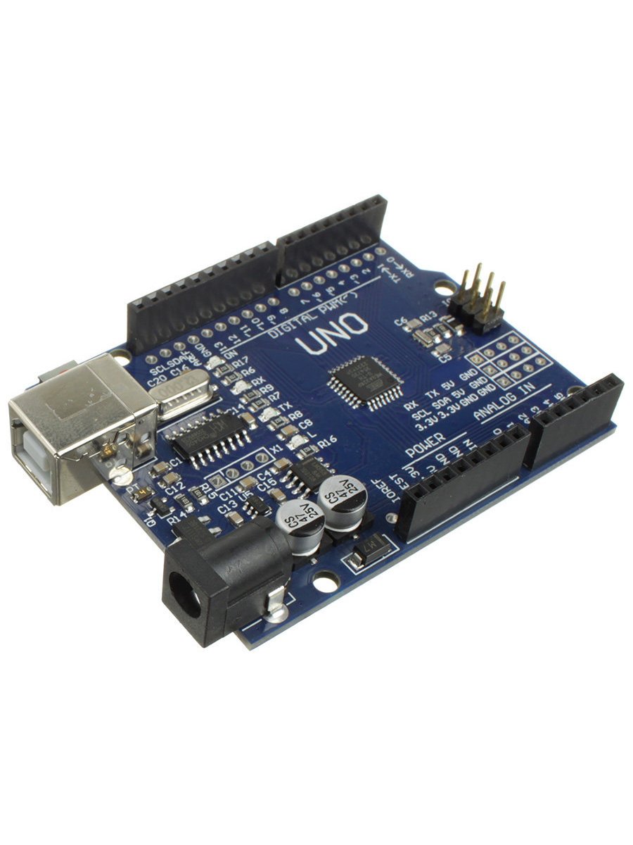 Arduino Uno построена на базе микроконтроллера ATmega328. Платформа имеет 14 цифровых ввода/ выходов (6 из которых могут использоваться как выходы ШИМ), 6 аналоговых входов, кварцевый генератор 16 МГц, разъем USB, силовой разъем, разъем ICSP и кнопку перезагрузки. Для работы необходимо подключить платформу к компьютеру посредством кабеля USB или подать питание при помощи адаптера AC/DC, или аккумуляторной батареей.
