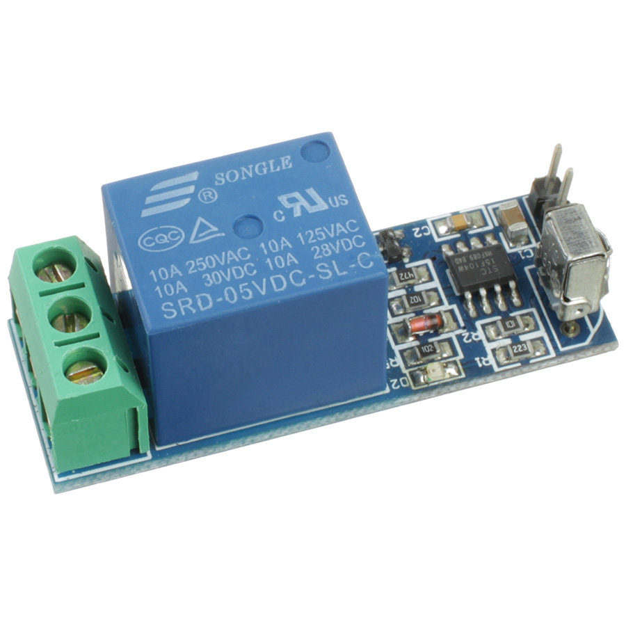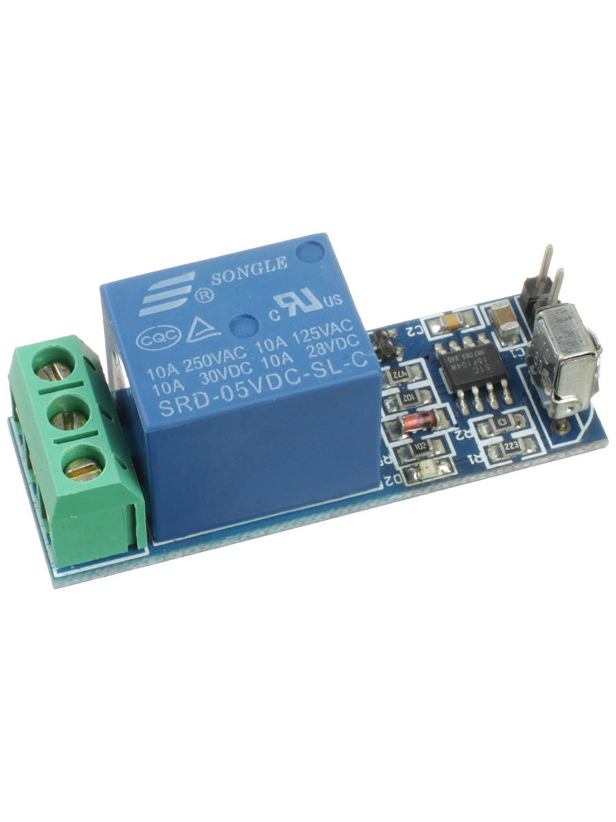 Управление осуществляется в инфракрасном диапазоне. С помощью модуля можно получить дистанционный ИК выключатель, который может удаленно управлять приборами и устройствами с током потребления до 10 А. Исполнительным элементом служит электромагнитное реле с одной переключающей группой контактов, что позволяет использовать устройство как в режиме размыкания контактов, так и на замыкание. Назначение контактов обозначено на печатной плате. Для подключения питания на модуле установлен 2х контактный разъем, для подключения нагрузки – клеммник под отвертку. Пульт управления имеет 1 кнопку управления, первое нажатие приводит модуль реле в режим "Вкл", на печатной плате приемника включается светодиод синего цвета, повторное нажатие подает команду "Выкл" и светодиод гаснет.