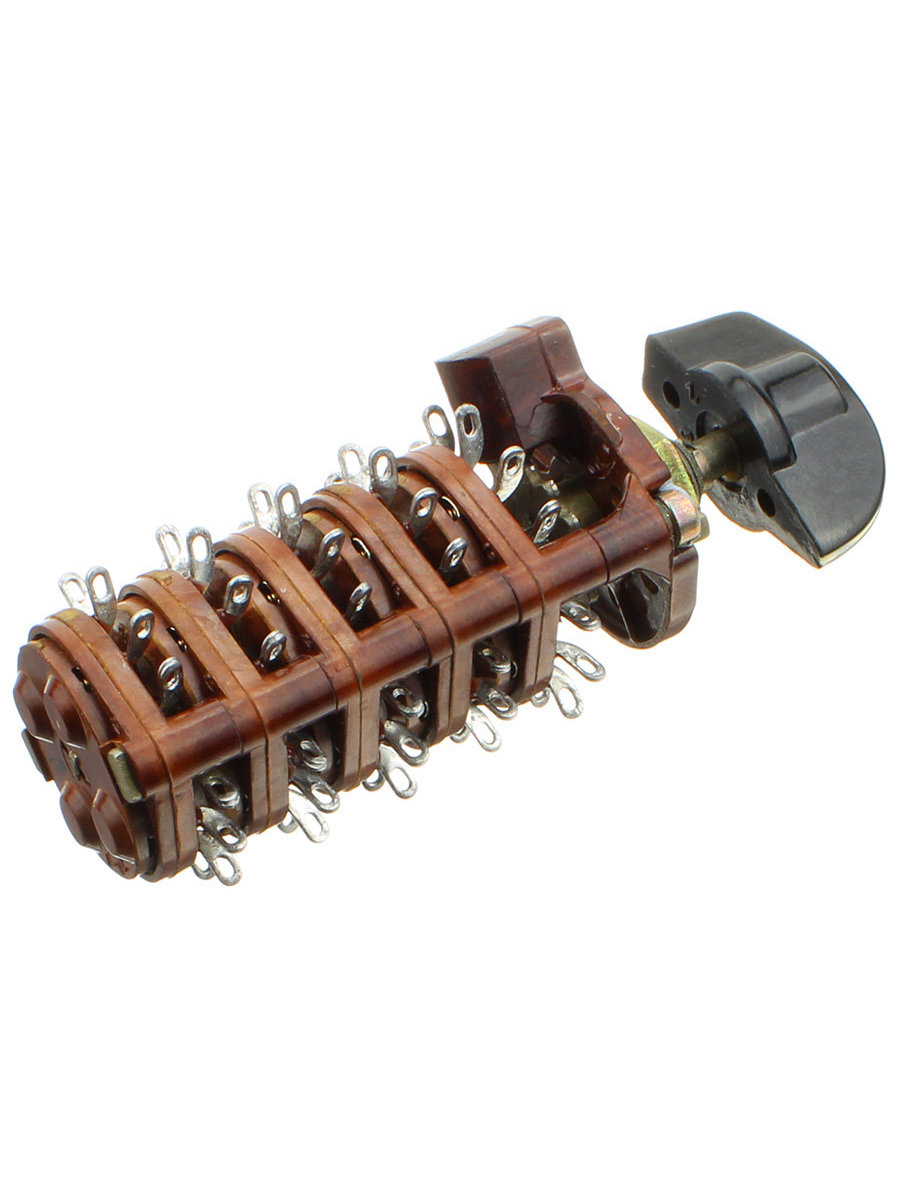 Переключатели галетные ПМ, ПМ2 – переключатели галетные карболитовые, их еще называют галетники, коммутируют цепи сигнализации и управления с напряжением до 300В, силой тока до 2А и коммутируемой мощностью до 25Вт. Переключатель обеспечивает поворотное переключение контактов, расположенных на галетах (платах) в количестве от 1-й до 5-ти, в положениях от 2-х до 11-ти и в направлениях от 1-го до 20-ти. Переключатели крепятся путем фиксации оси в отверстии панели с помощью резьбы оси и гайки переключателя.