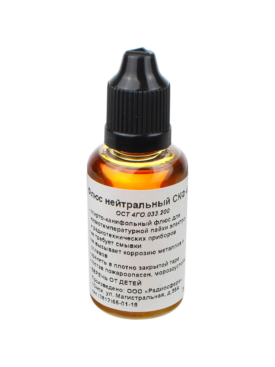 Спирто-канифольный флюс (СКФ) — это жидкий паяльный флюс, который представляет собой раствор канифоли в этиловом спирте. Он используется для удаления оксидов и улучшения качества пайки при работе с электронными компонентами и печатными платами.