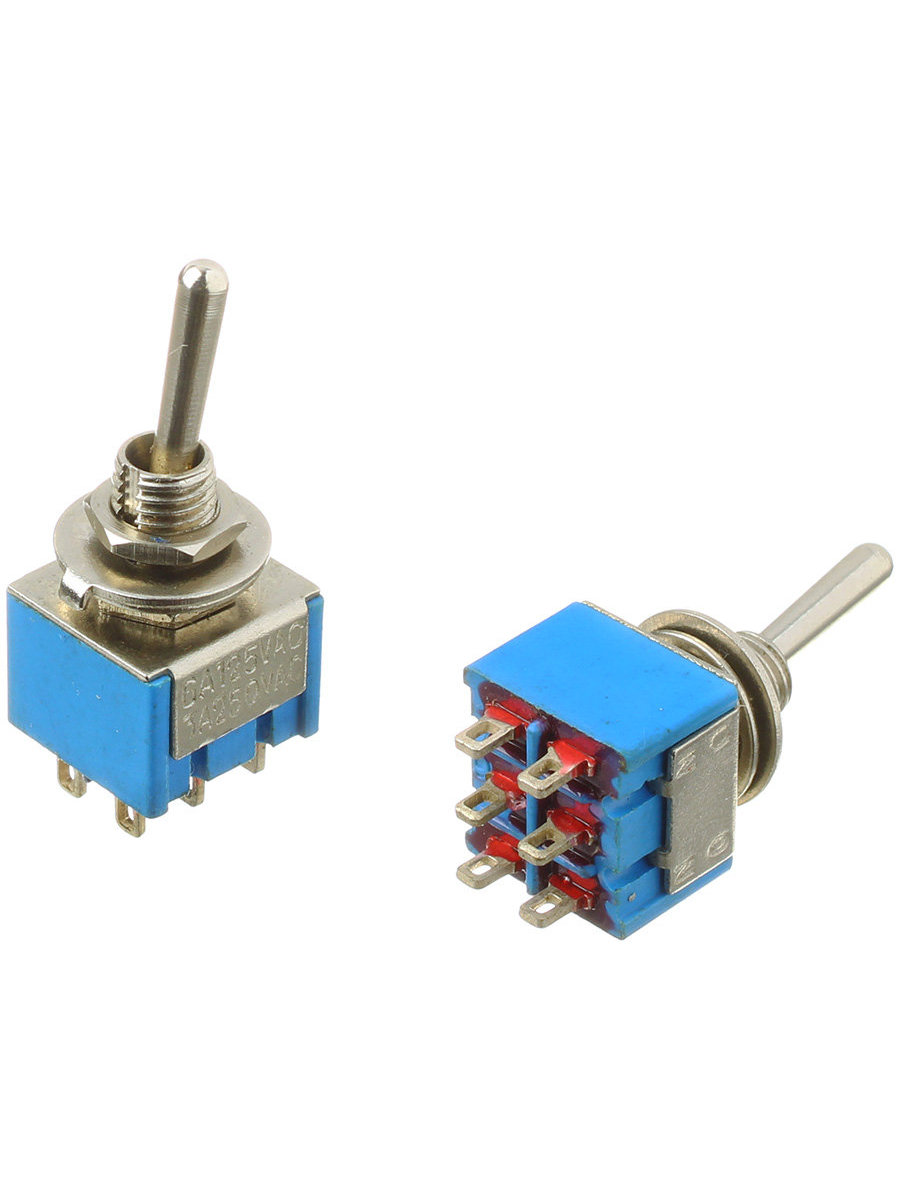 Тумблер MTS-202 предназначен для коммутации злектрических цепей в различных устройствах. Сила тока при рабочем напряжении 220 В составляет 3 А.Соответственно 6 А при рабочем напряжении 125 В.Тумблер имеет среднюю точку и выполняет функцию переключения в двух направлениях. Конструкцией MTS-202 предусмотрены 2 группы контактов по 3 в каждой. Размер установочного отверстия 5.5 мм.