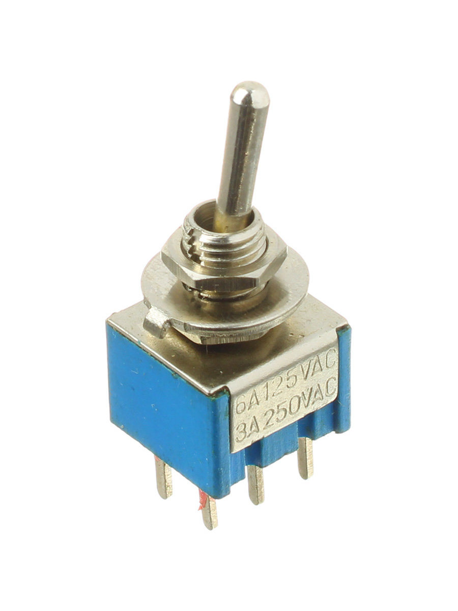 Тумблер MTS-202 предназначен для коммутации злектрических цепей в различных устройствах. Сила тока при рабочем напряжении 220 В составляет 3 А.Соответственно 6 А при рабочем напряжении 125 В.Тумблер имеет среднюю точку и выполняет функцию переключения в двух направлениях. Конструкцией MTS-202 предусмотрены 2 группы контактов по 3 в каждой. Размер установочного отверстия 5.5 мм.
