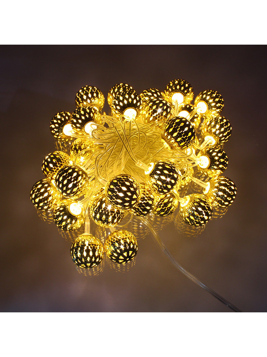 30 светодиодов, диаметр золотистого металлического шарика 15мм, расстояние между светодиодами 8см