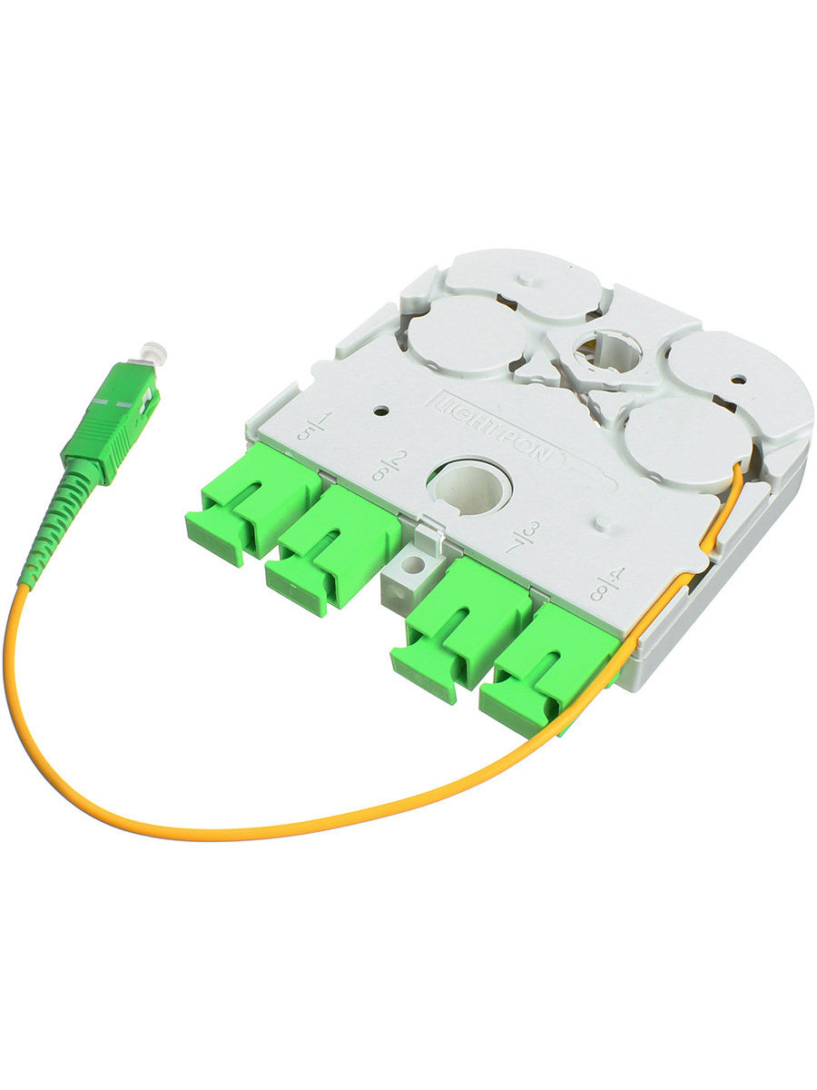 УСМ 1х4, универсальный сплиттерный модуль на 4 абонента, SC/APC, LIGHT PON предназначен для подключения до 4-х абонентов по технологии GPON/GEPON/FTTH. УСМ 1х4 LIGHT PON имеет в конструкции оптический планарный разветвитель (PLC сплиттер) делением 1х4, изготовленный по технологии PLC и, соответственно, обладает равномерным делением на каждое ответвление.