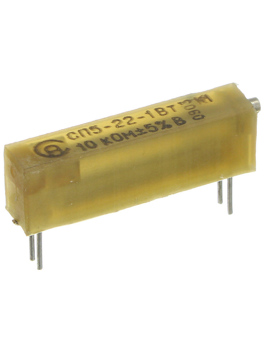 Резисторы СП5-22 переменные подстроечные проволочные, для печатного монтажа. Прямоугольные многооборотные с прямолинейным перемещением подвижной контактной системы, производимым микрометрическим винтом. Изменение сопротивления от минимального до максимального значения производится за 60 оборотов. Предназначены для работы в цепях постоянного и переменного тока частотой до 1000 Гц. Промежуточные значения номинальных сопротивлений соответствуют ряду Е6 с допусками ±5; ±10%. Функциональная характеристика - линейная А.