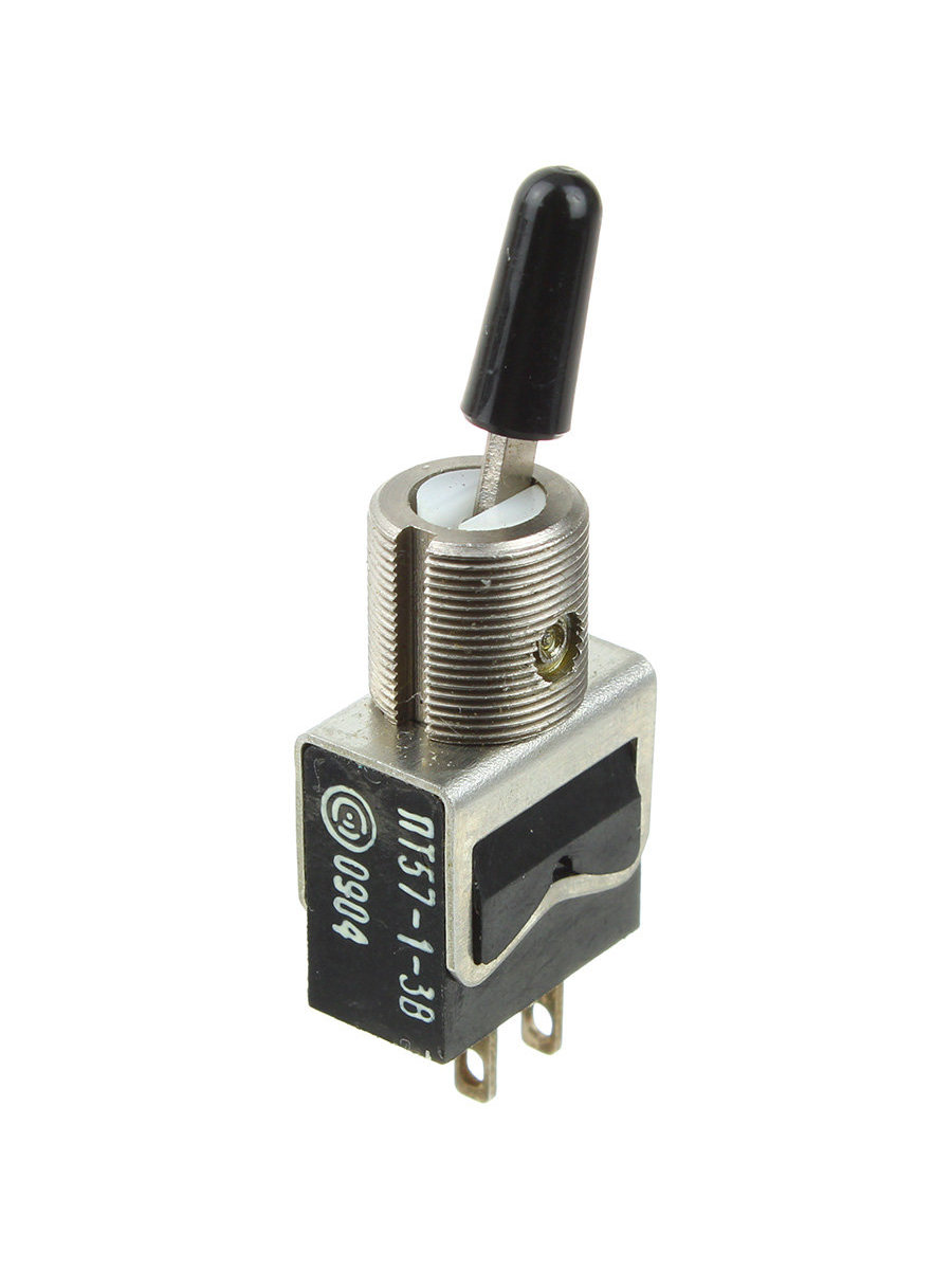 Тумблер ПТ57-1-3В миниатюрный перекидной переключатель для коммутации электрических цепей постоянного и переменного тока с частотой до 1000 Гц. Предназначен для работы в радиоэлектронной аппаратуре общего и специального назначения.