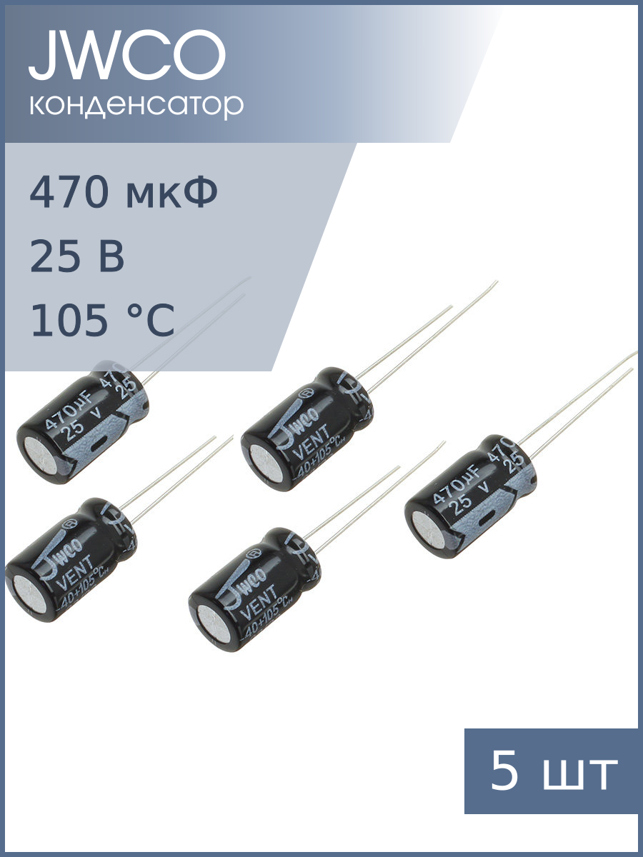 Конденсатор 470мкФ 25В 8*14мм 105С (упаковка 5шт) Jwco KM471M1EBKJ0814VBK 410мА 2000час