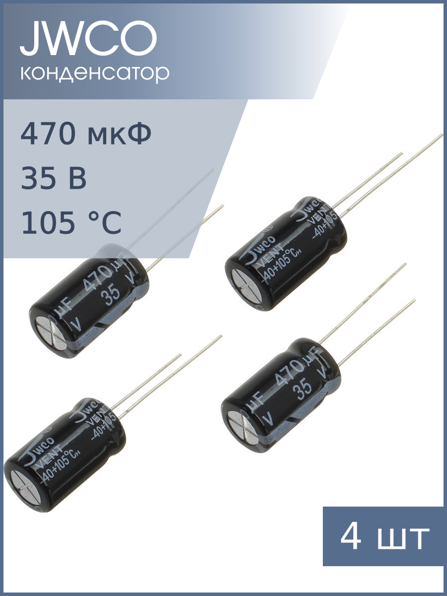 Конденсатор 470мкФ 35В 10*17мм 105С (упаковка 4шт) Jwco KM471M1VBKJ1017VBK 520мА 2000час