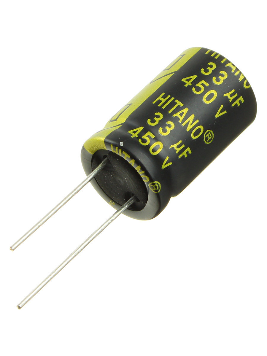 Тип Конденсатор алюминиевый электролитический 33мкФ 450В ±20% (16 X 26мм) радиальный 7.5мм 460мА 5000час 105С россыпь