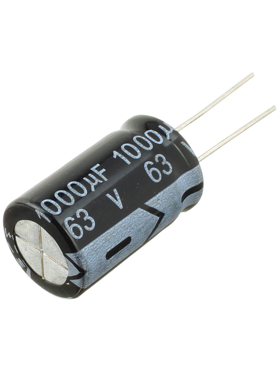 Тип Конденсатор алюминиевый электролитический 1000мкФ 63В ±20% (16 X 25мм) радиальный 7.5мм 2000час 105С россыпь