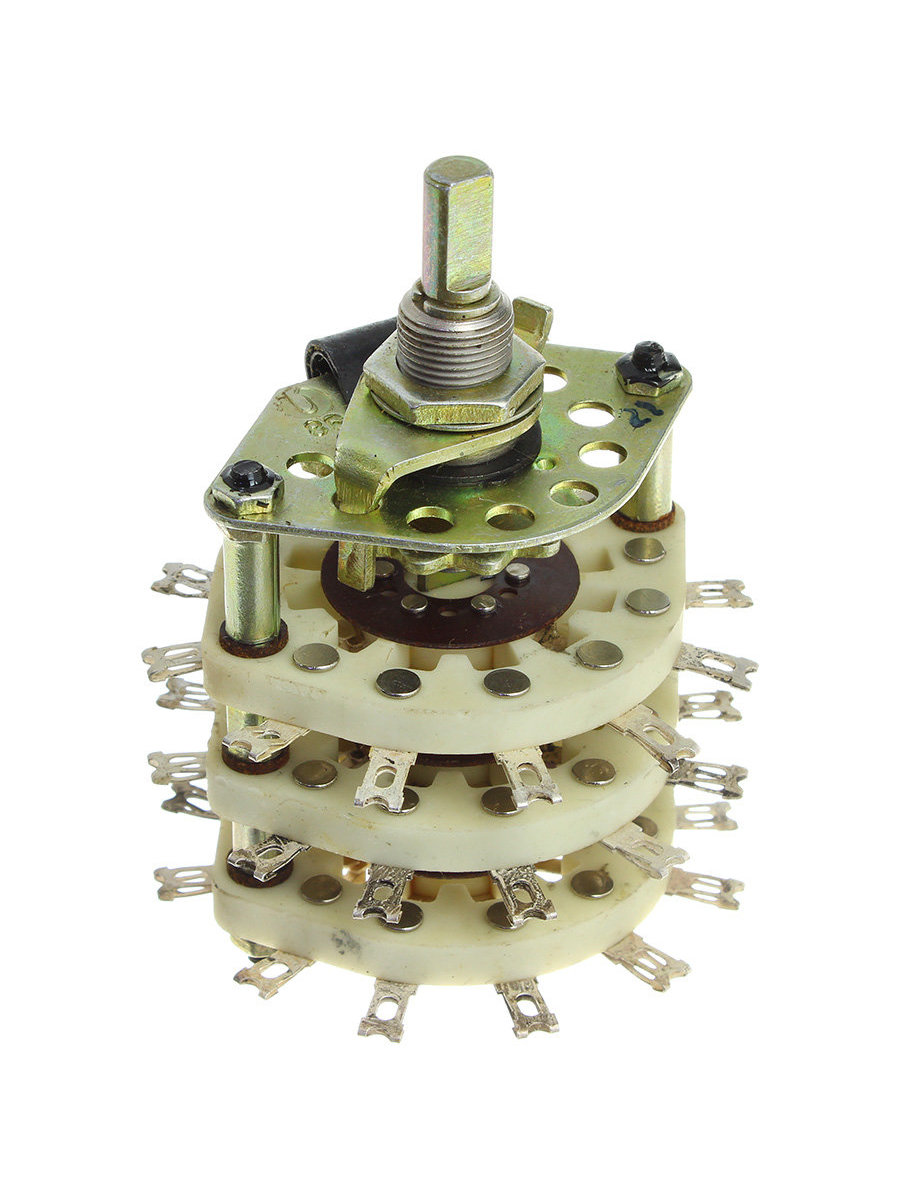 Переключатель галетный ПГГ-11П4Н6-А 1986 года производства предназначен для коммутации электрических цепей постоянного тока, а также переменного тока низкой и высокой частоты. Расшифровка: ПГК - переключатель галетный с керамическими платами; 11П - число рабочих положений; 4Н - число направлений; А - исполнение вала ВС-3 (прямая лыска). Максимальная коммутируемая мощность 70W AC, 15W DC; максимально коммутируемый ток 3A AC, 0,5A DC; рабочее напряжение 350V. Ручка поставляется отдельно. В качестве ручки может использоваться любая с внутренним диаметром - 6мм, пример: Клювик для ПГК (6 мм) метал. втулка, Ручка управления НА 4.252.011 (6 мм), Ручка НА 4252007 (6мм).