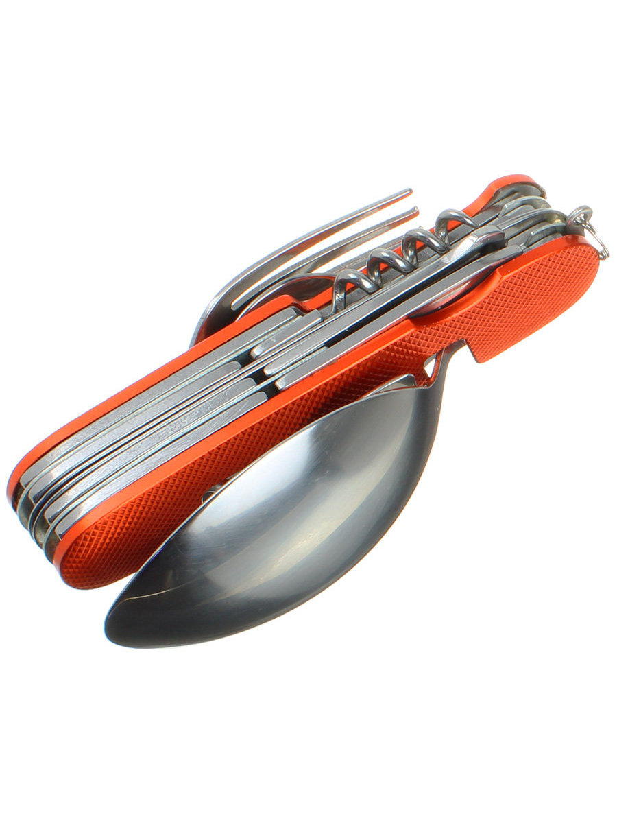 Столовая ложка и вилка расположены в разных половинах разъемной рукоятки ножа. Штопор, консервный нож комбинированный - для бутылок и жестяных банок. Шило, крючок, лопатка, маленькая ложка