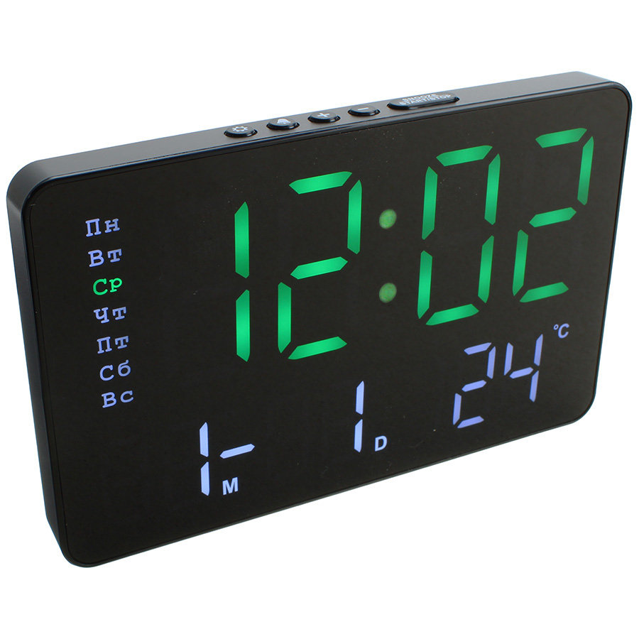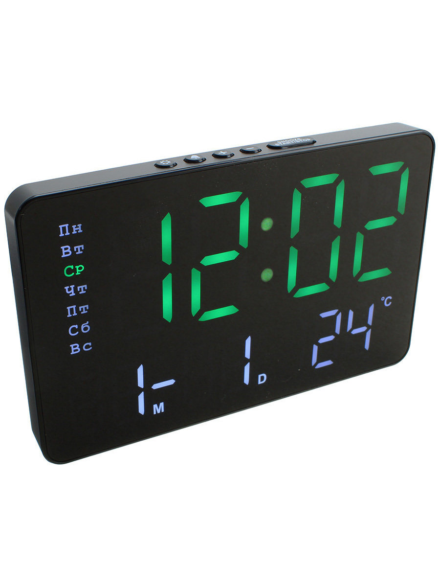 Часы электронные с календарём, будильником, термометром показывают время (24-часовой формат)
