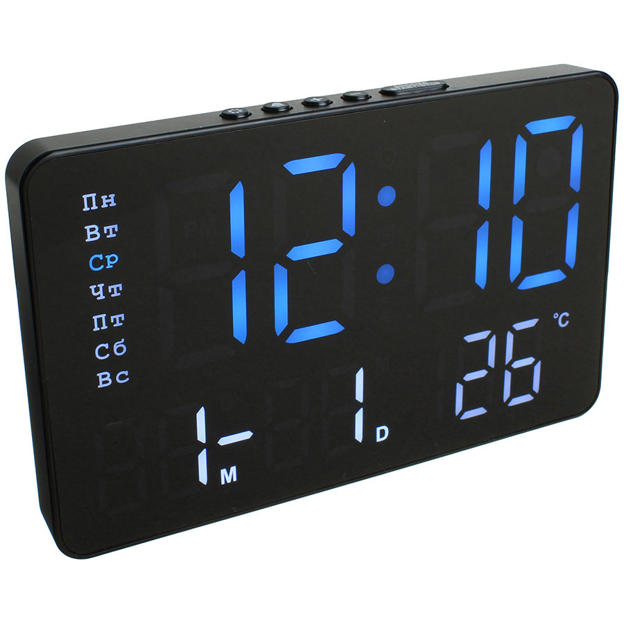 Часы электронные с календарём, будильником, термометром показывают время (24-часовой формат)