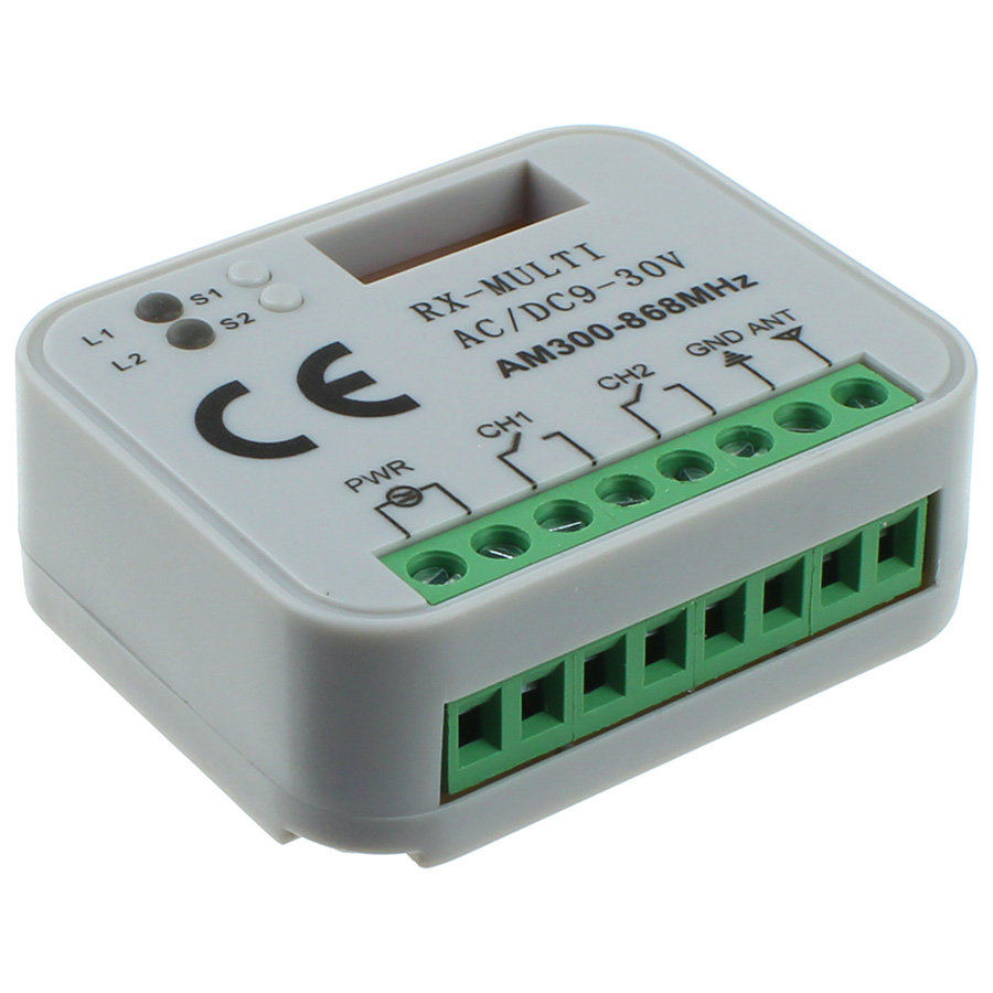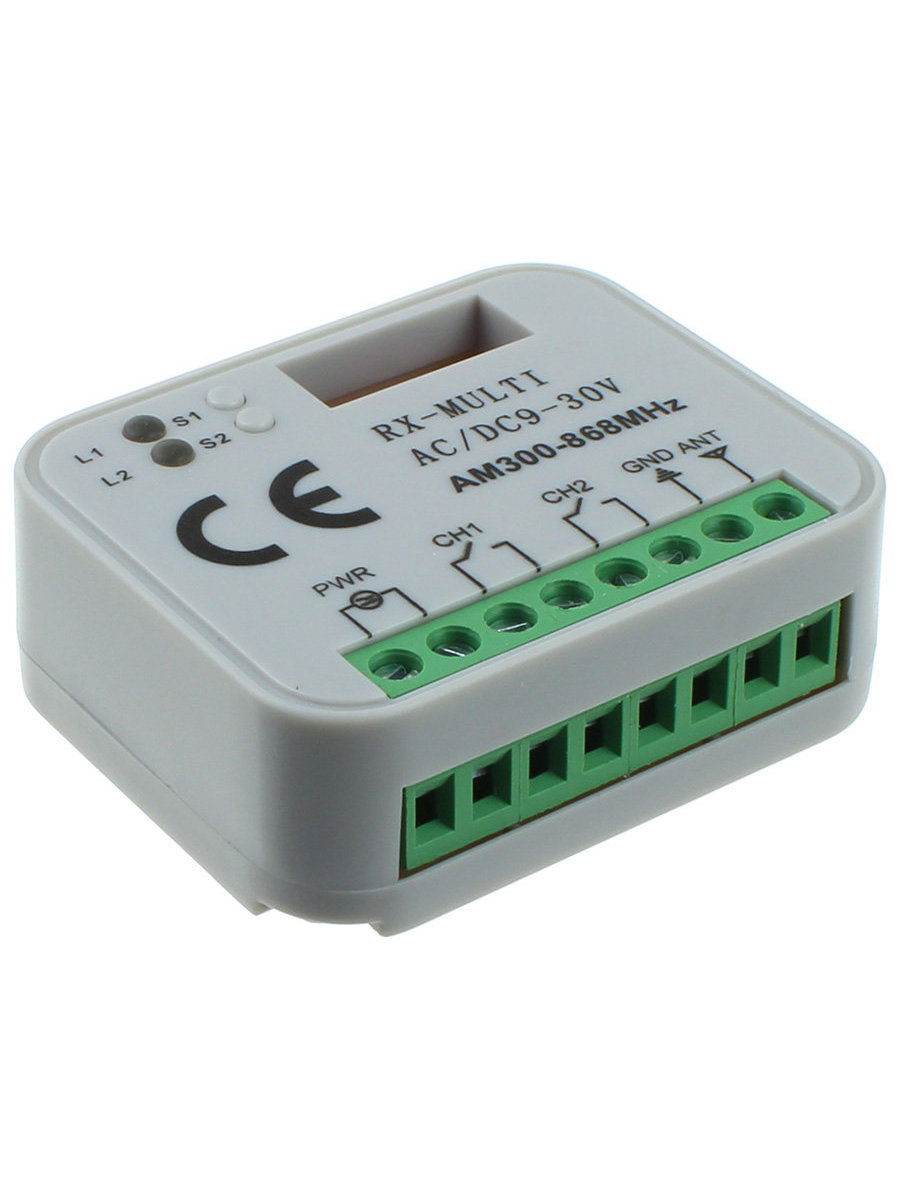 Приемник RX-MULTI, может работать с пультами дистанционного управления разных производителей и на разных частотах. При помощи имеющихся ДИП-переключателей возможно выбрать один из 20 возможных совместимых вариантов. После выбора необходимого варианта приемник будет принимать коды пультов управления только выбранного варианта. Приемник RX-MULTI работает на частотах 433 Мгц и 868 Мгц, память до 500 различных кодов, питание 12-24В AC/DC.