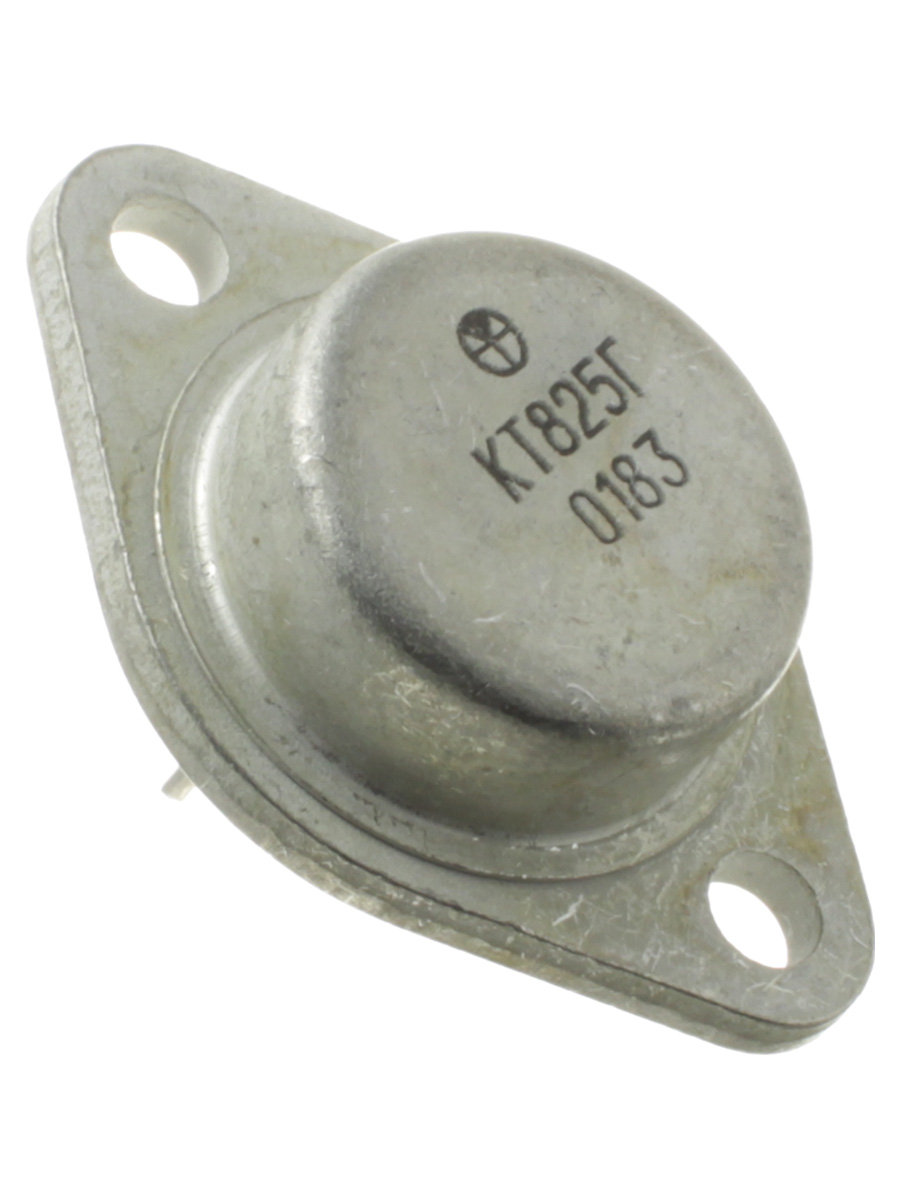 Транзисторы КТ825Г кремниевые мезапланарные структуры p-n-p составные, переключательные. Предназначены для применения в усилителях и переключающих устройствах. Используются для работы в электронной аппаратуре общего назначения. Выпускаются в металлическом корпусе со стеклянными изоляторами и жёсткими выводами.