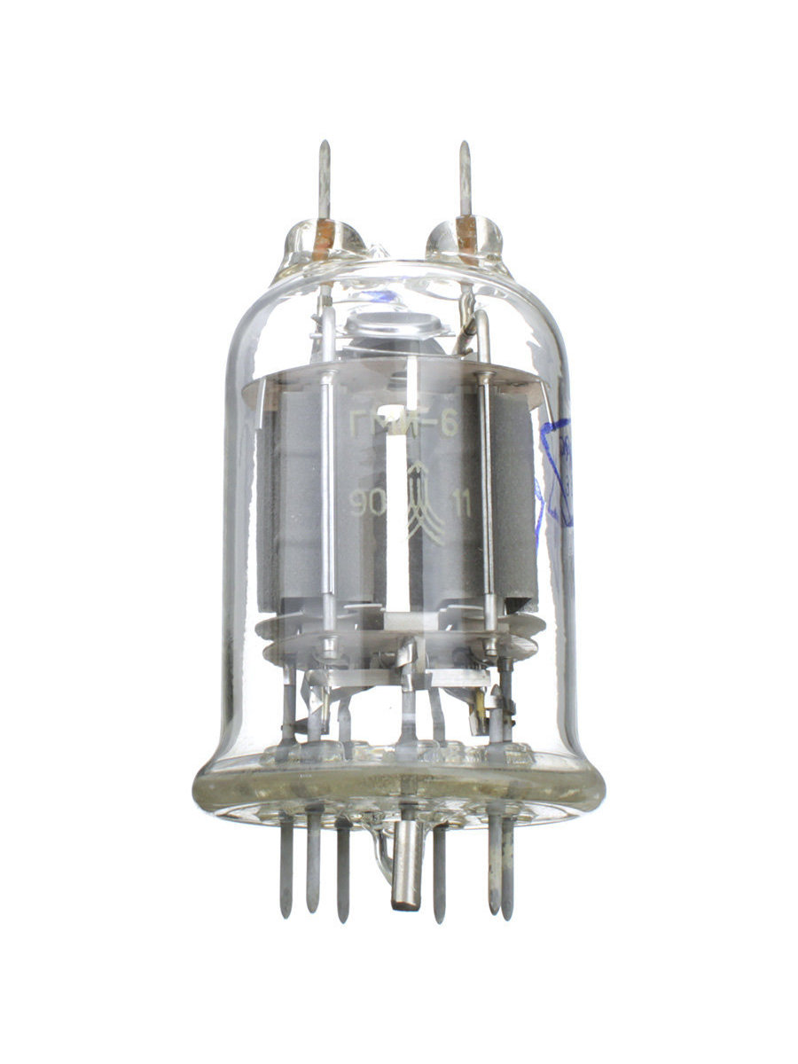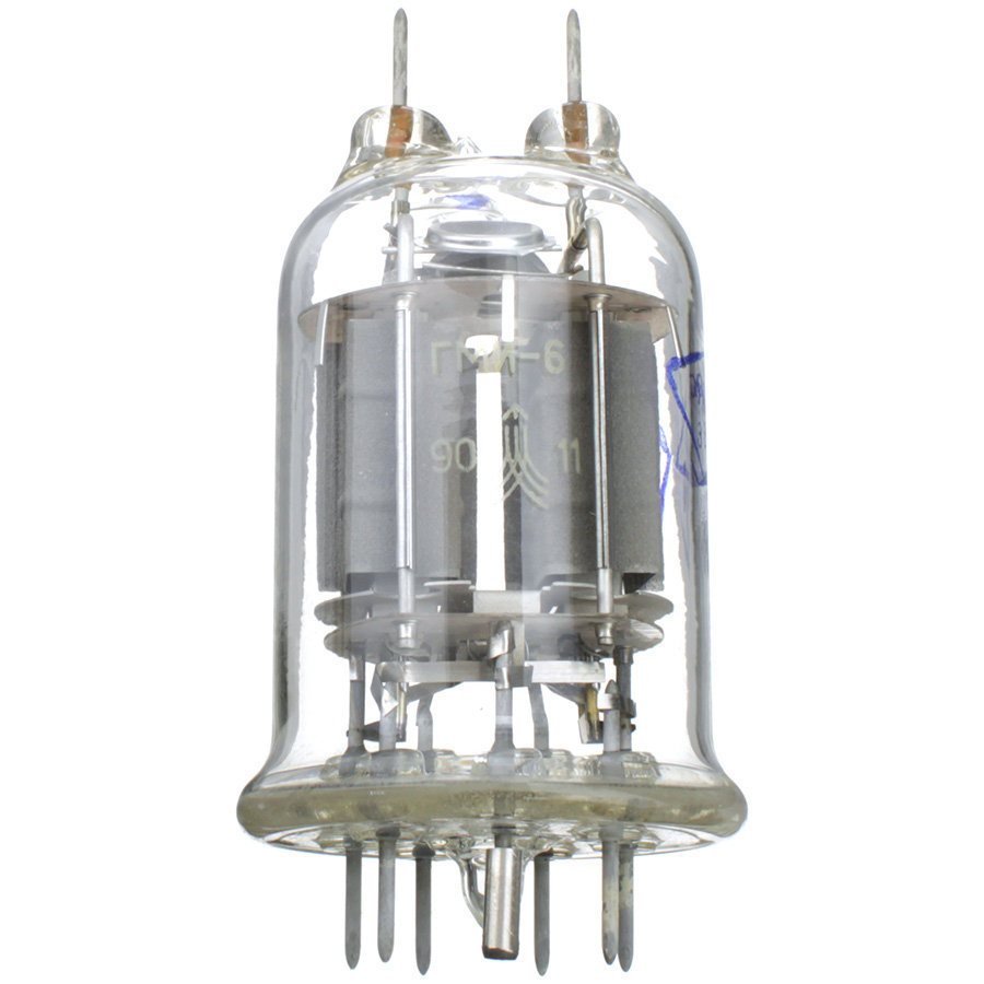 Импульсный модуляторный двойной лучевой тетрод ГМИ-6 в стеклянном исполнении с оксидным катодом косвенного накала и естественным воздушным охлаждением. Предназначен для коммутации импульсной мощности в импульсных модуляторах при напряжении анода в импульсе до 4 кВ и тока в импульсе более 8 А. Импульсный модуляторный тетрод ГМИ-6 применяется в стационарных и передвижных радиотехнических устройствах общего или специального назначения. Выпускается в стеклянном бесцокольном оформлении с 6-штырьковыми выводами электродов и двумя отдельными выводами анода Работает в любом положении. Охлаждение воздушное естественное. Габаритные размеры тетрода ГМИ-6: - высота лампы не более 95 мм; - диаметр лампы не более 48 мм. Масса не более 70 г.
