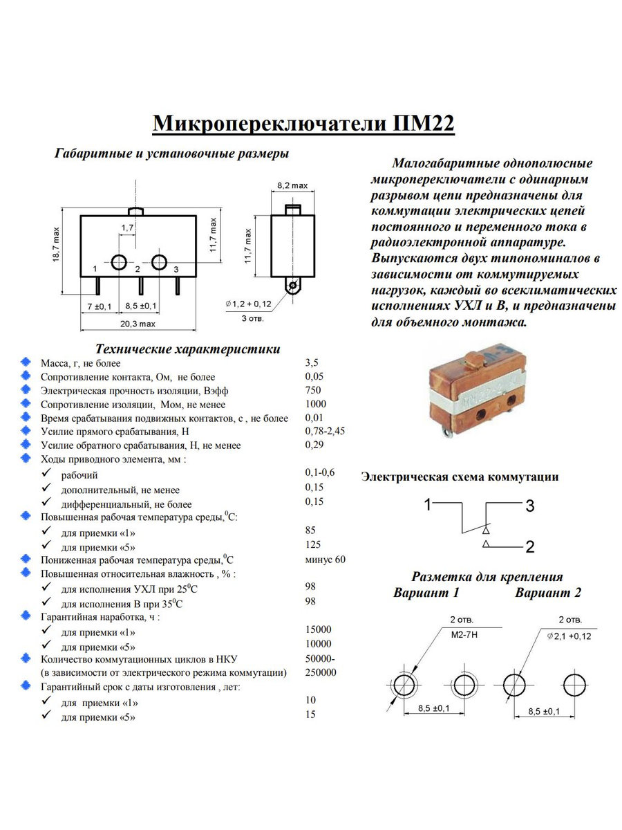 Миниатюрный однополюсный микропереключатель серии ПМ22 с одинарным разрывом цепи, применяется в системах управления и сигнализации для коммутации электрических цепей постоянного и переменного тока в радиоэлектронной аппаратуре. Контактная группа микропереключателей выполняет функцию включения, отключения или переключения с одного направления цепи на другое. Микропереключатели выполнены в карболитовых корпусах и крепятся путём фиксации в отверстиях на панели с помощью винтового соединения. Конструкция контактных выводов обеспечивает подсоединение монтажных проводов при помощи пайки. Степень защиты IP40. Выпускается в климатическом исполнении УХЛ и В.