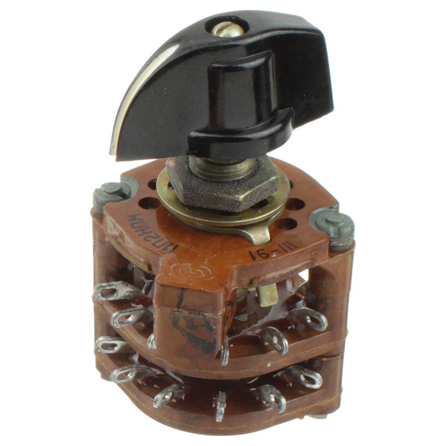 ПМ-11П2Н переключатель галетный карболитовый, малогабаритный, применяется для коммутации цепей сигнализации и управления с напряжением до 300В, силой тока до 2А и коммутируемой мощностью до 25Вт. Переключатель обеспечивает поворотное переключение контактов, расположенных на галетах. Метод монтажа путем фиксации оси в отверстии панели.