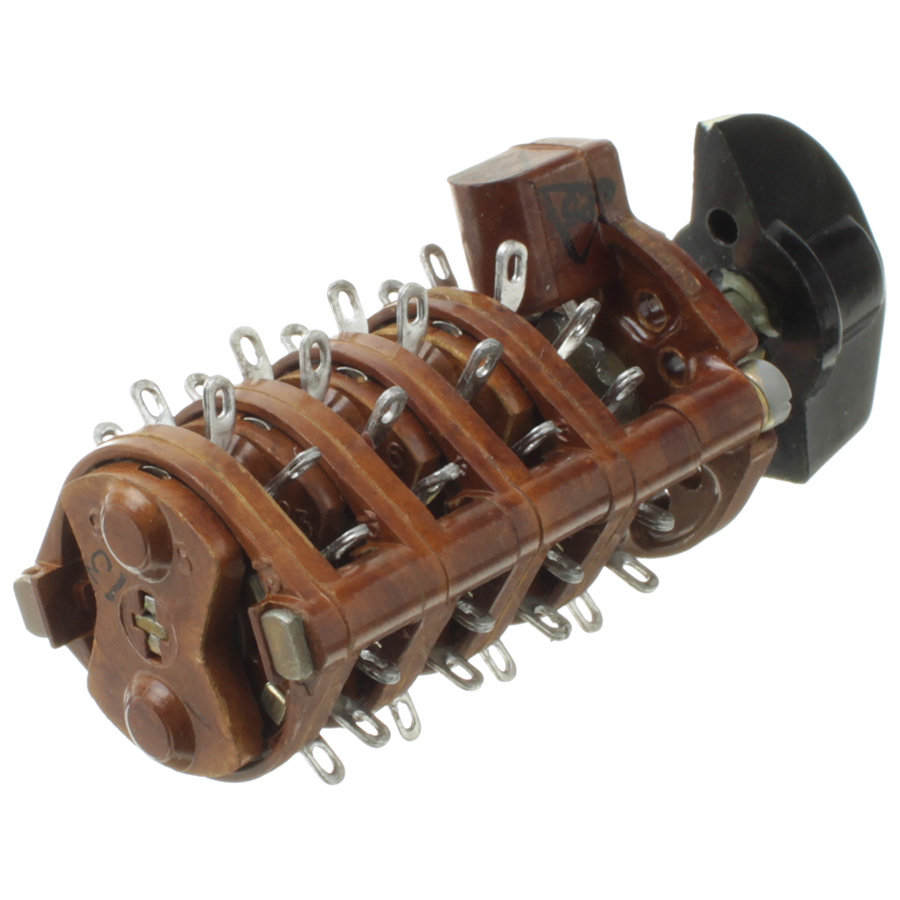 ПМ-5П8Н переключатель галетный карболитовый, малогабаритный, применяется для коммутации цепей сигнализации и управления с напряжением до 300В, силой тока до 2А и коммутируемой мощностью до 25Вт. Переключатель обеспечивает поворотное переключение контактов, расположенных на галетах. Метод монтажа путем фиксации оси в отверстии панели.