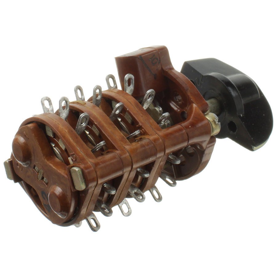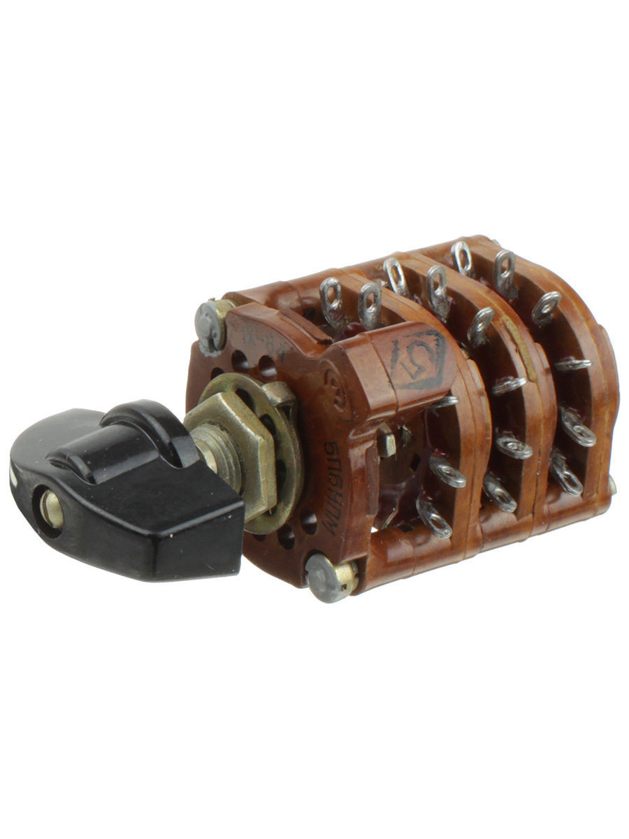 ПМ-5П6Н переключатель галетный карболитовый, малогабаритный, применяется для коммутации цепей сигнализации и управления с напряжением до 300В, силой тока до 2А и коммутируемой мощностью до 25Вт. Переключатель обеспечивает поворотное переключение контактов, расположенных на галетах. Метод монтажа путем фиксации оси в отверстии панели.