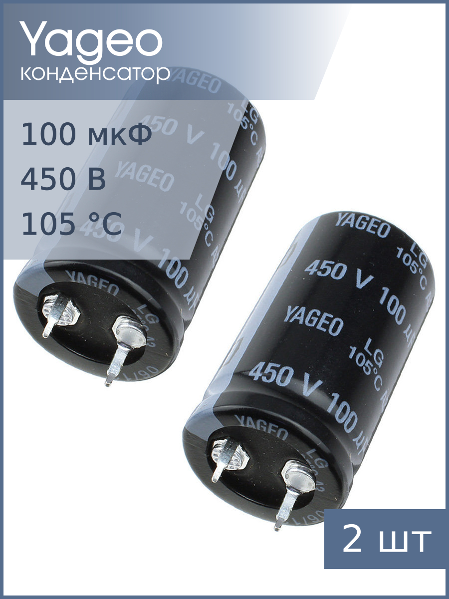 Конденсатор 100мкФ 450В 22*40мм 105C (упаковка 2шт) Yageo LG450M0100BPF-2240 Snap-in 650мА 2000час