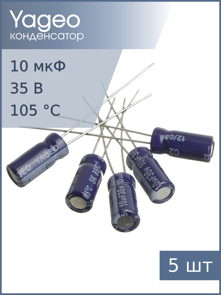| Комплектация | Конденсатор 10мкФ 35В Yageo SK035M0010B2F-0511 5шт |
