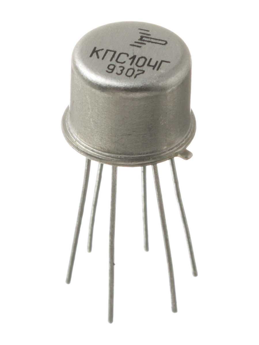 Транзисторная сборка КПС104Г состоящая из двух кремниевых эпитаксиально-планарных ионнолегированных полевых с затвором на основе p-n перехода с каналом n-типа транзисторов. Сборка предназначена для применения в входных каскадах дифференциальных малошумящих усилителей низкой частоты и постоянного тока с высоким входным сопротивлением. Выпускается в металлостеклянном корпусе гибкими выводами. Тип прибора указывается на корпусе. Масса транзистора не более 2 г.