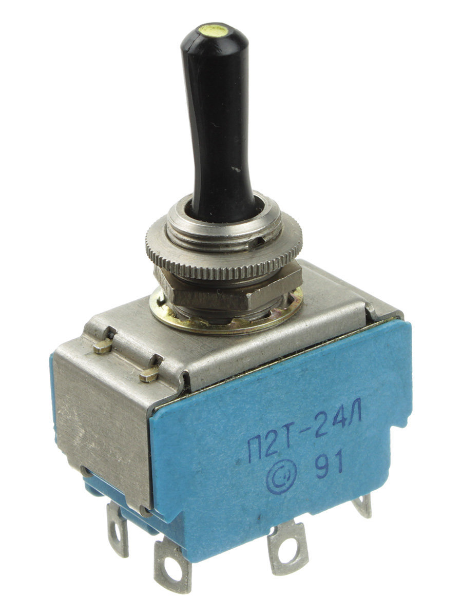 Тумблер П2Т-24 перекидной двухполюсный переключатель с двухпозиционной фиксацией ручки управления. Предназначен для коммутации электрических цепей постоянного и переменного тока при напряжении не более 300 В при силе тока до 6 А. Используется для работы в радиоэлектронной аппаратуре специального и общего назначения. Тумблеры П2Т крепятся в отверстии на панели путём фиксации с помощью резьбового соединения. Покрытие контактов: серебро. Монтаж выводов: под пайку.
