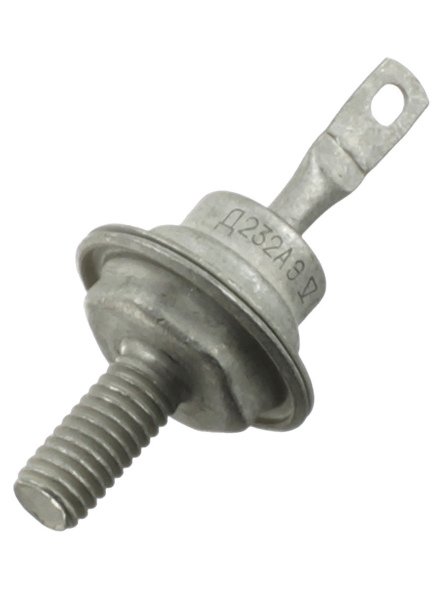 Д232А Диоды Д232А кремниевые, диффузионные, выпрямительные. Предназначены для преобразования переменного напряжения частотой до 1,1 кГц. Используются для работы в выпрямительных устройствах источников вторичного электропитания аппаратуры специального назначения. Выпускаются в металлическом герметичном корпусе со стеклянными изоляторами и винтом для крепления. Маркируются цифро-буквенным кодом, схема соединения электродов с выводами приводится на корпусе. Т