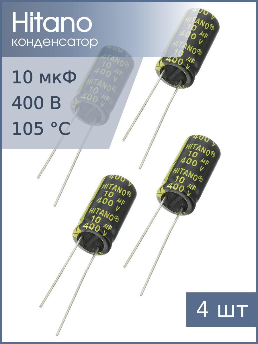 Конденсатор 10мкФ 400В 10*21мм 105C (упаковка 4шт) Hitano EXR100M2GBA 213мА 5000час
