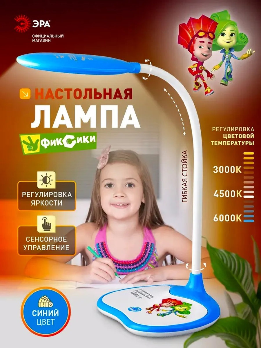 Светильник настольный Эра Настольная лампа ЭРА NLED-433-6W-BU мощностью на 6Вт создана по мотивам популярного современного мультфильма, которая станет прекрасным дополнением к интерьеру детской комнаты.Настольный светильник оснащен сенсорным управлением на корпусе. Светодиодная лампа имеет три режима цветовой температуры 3000К-6000К. При помощи плавного диммера, можно регулировать яркость освещения. Гибкая стойка предназначена для регулировки высоты.