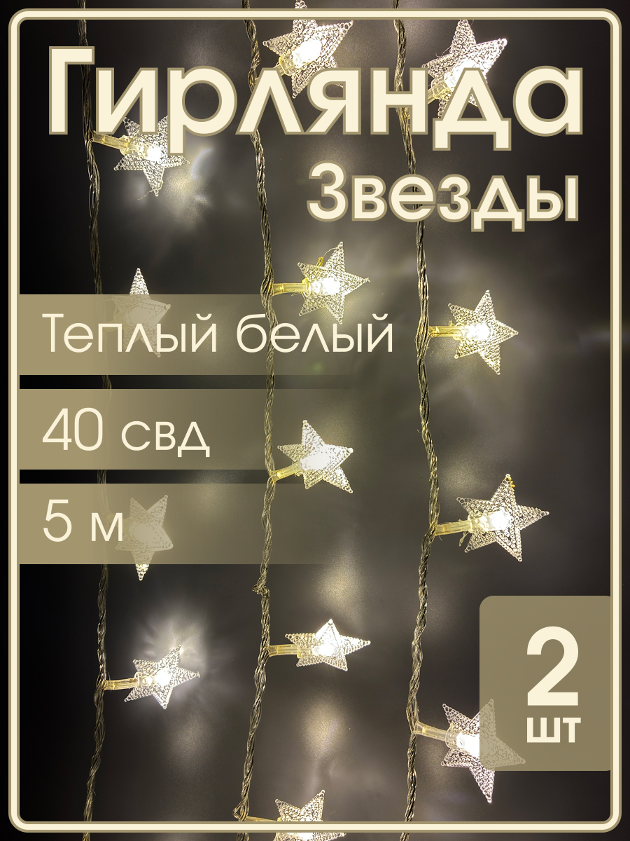 Гирлянда 40 свд, 5 метров, звезды, теплая белая, упаковка 2шт