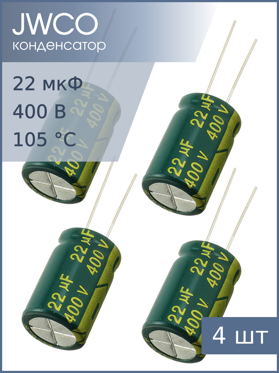Конденсатор 22мкФ 400В 13*21мм 105С (упаковка 4шт) JWCO LF220M2GBKJ1321EGN 275мА 4000час