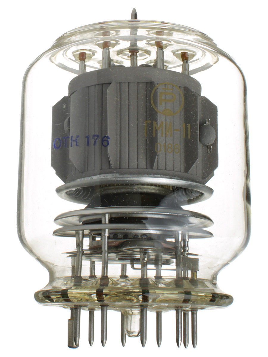 Импульсный модуляторный тетрод ГМИ-11 в стеклянном исполнении с оксидным катодом косвенного накала с естественным или принудительным воздушным охлаждением. Предназначен для работы в импульсных модуляторах при напряжении анода в импульсе до 10 кВ и тока в импульсе более 14 А. Импульсный модуляторный тетрод ГМИ-11 применяется в радиотехнической аппаратуре общего или специального назначения. Выпускается в стеклянном бесцокольном оформлении с 10-штырьковыми выводами электродов и отдельным выводом анода. Работает в вертикальном положении, выводами вниз. Расположение штырьков: РШ26. Охлаждение воздушное естественное или принудительное. Габаритные размеры тетрода ГМИ-11: - высота лампы не более 135 мм; - диаметр лампы не более 80 мм. Масса не более 300 г.